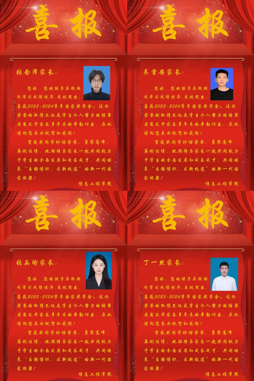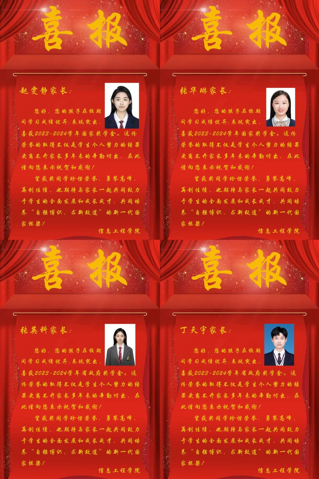 一纸沉甸甸的喜报,蕴含无上荣光,饱含着信息工程学院对学子的鼓励和认可,是学子荣誉的象征、成长的见证、努力的回报,也承载着每位家长的期盼与慰藉。喜报的精心设计不仅体现了学院对细节的关注,更深刻展现了太阳成集团tyc9728“润物细无声”的育人态度。太阳成集团tyc9728希望通过最传统的方式与家长分享员工成长过程中的重要时刻,鼓励更多的员工在今后的学习和生活中积极进取,奋发向上。员工家长在收到学院发送的喜报后为孩子取得的优异成绩而自豪,并感谢学院给予他们这样一份温暖的礼物。他们表示,荣誉不仅仅是孩子个人的努力,更离不开学院和老师们的悉心教育与培养,他们也将继续与学院携手,积极参加家校互动,发挥家校协同育人作用。
